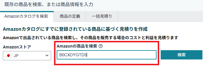 「商品情報(詳細)」のASINをコピーして、料金シミュレーターの検索窓に貼り付けます。