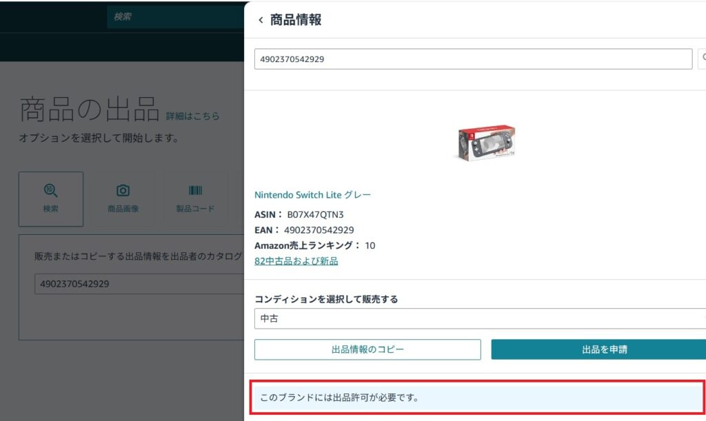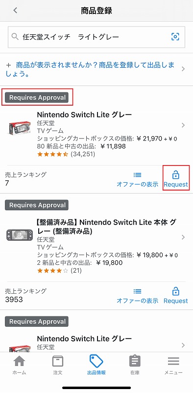 商品名やバーコードをスキャンし、「Requires Approval」「Request」表示があれば出品規制対象です。